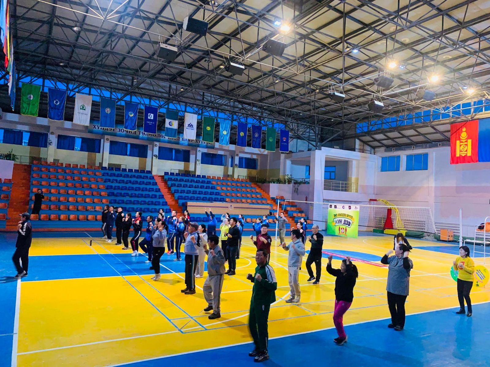 Нээлтийн үйл ажиллагаанд оролцогч иргэдэд “Мөнхийн хайрын урсгал” ТББ-ын Л.Арвинжаргал багш бие сэргээх, сунгалтын болон идэвхтэй дасгал хөдөлгөөнийг зааж хийлгэлээ. БҮХ НИЙТЭЭРЭЭ “ЭНЭ ЖИЛДЭЭ ЭРҮҮЛ ЖИНДЭЭ”