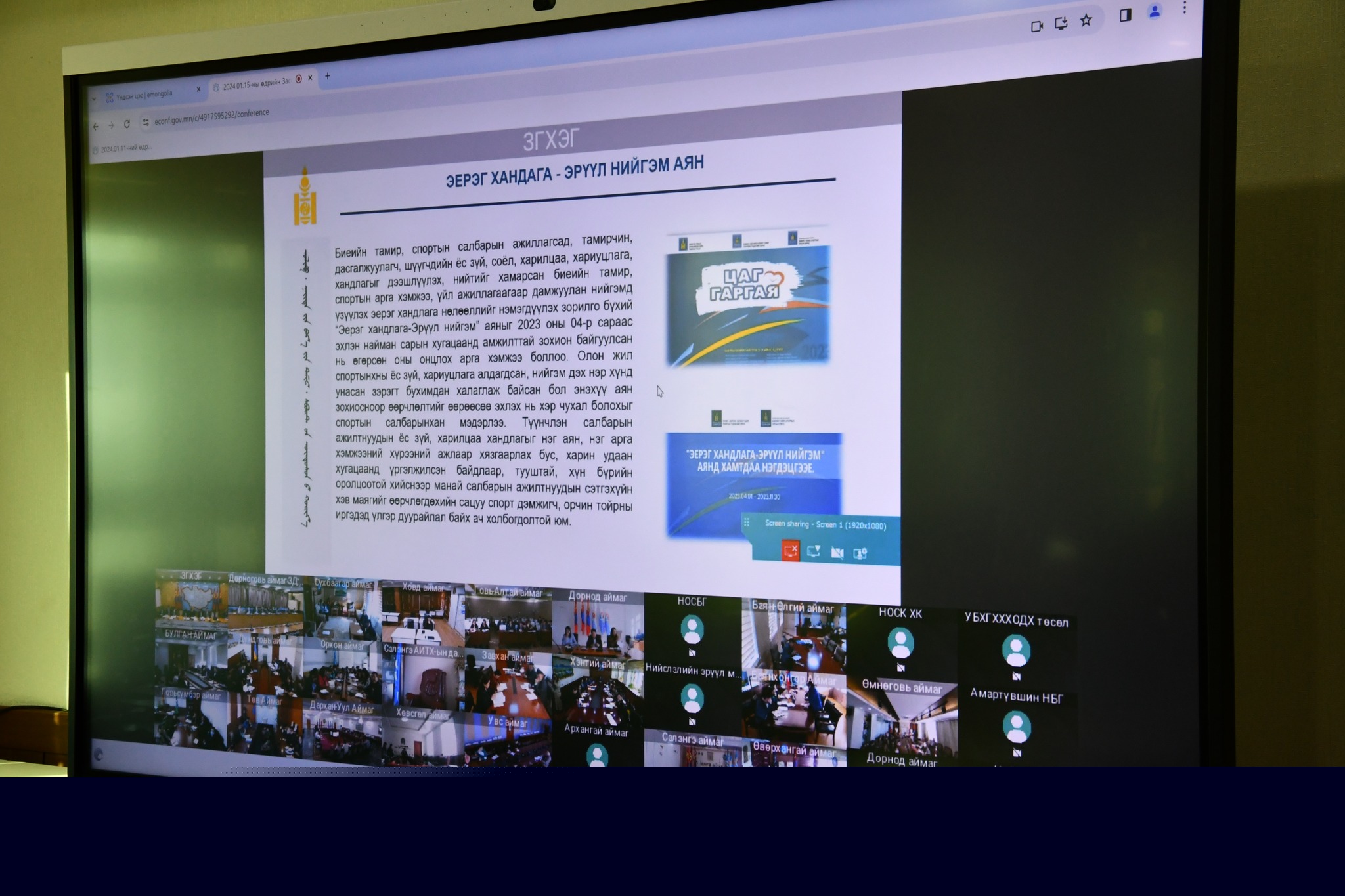 2024 оны 01 дүгээр сарын 15-ны өдөр Эрүүл мэндийн сайд, Боловсрол шинжлэх ухааны сайд, Соёлын сайд, Олимп, нийтийн биеийн тамир, спортын сайд нар холбогдох агентлагуудын дарга болон мэргэжилтнүүдтэй цахим уулзалт хийн 2023 оны хэрэгжүүлсэн үйл ажиллагааны талаар болон 2024 онд хэрэгжүүлэх үйл ажиллагааны чиглэл өгөн ажиллаа.